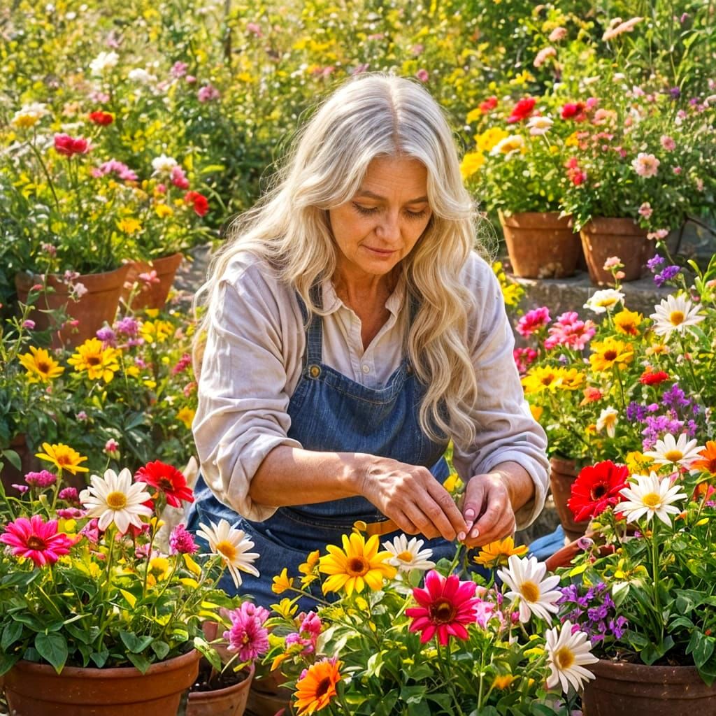 This image shows an elderly woman with long white hair carefully tending to numerous colorful flowers in pots, creating a vibrant garden scene.