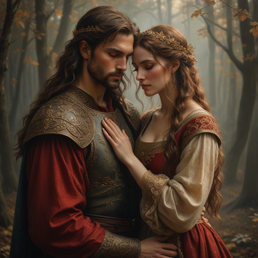 A romantic oil painting of a medieval couple standing in a misty autumn forest, illuminated by warm golden light and soft brushstrokes capturing their tender moment.