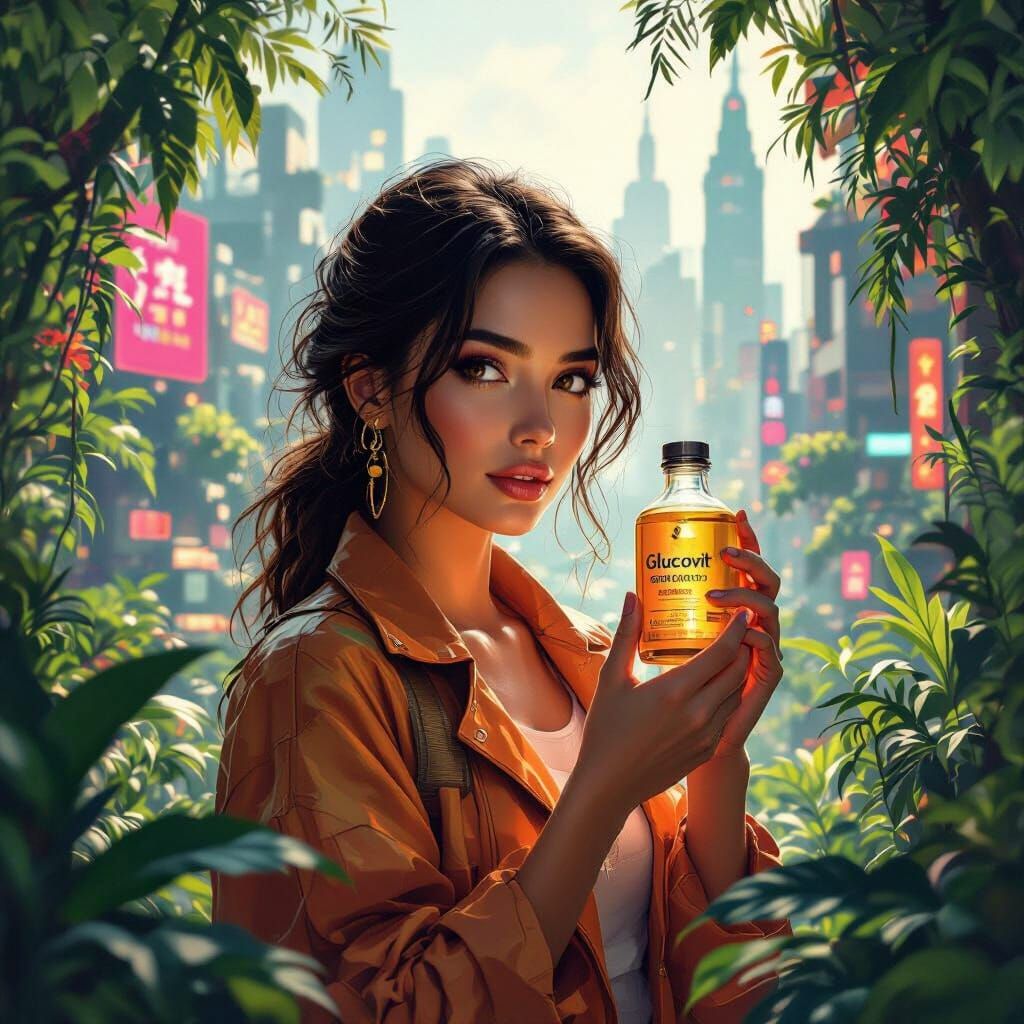 This image shows a woman in a city with lush greenery, holding a Glucovit bottle. The artwork features a vibrant, futuristic aesthetic with rich colors and intricate details, as a matte painting.