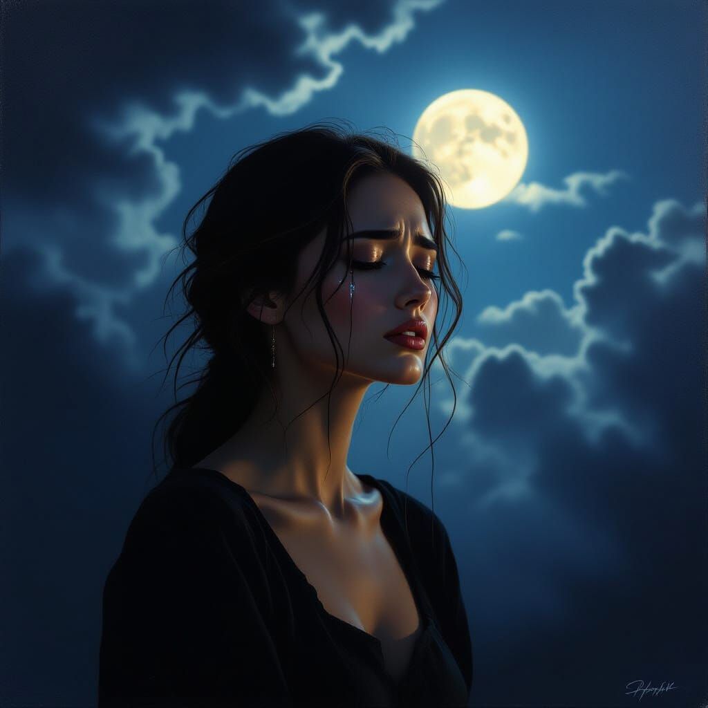 A poignant image of a woman succumbing to sorrow, her face showing weariness and tears. Dramatic lighting and deep colors enhance the emotional, hyperrealistic style.
