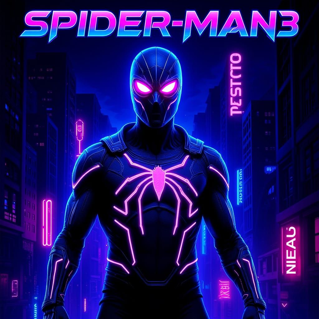 A futuristic, neon-drenched cityscape reimagines the Spider-Man 3 movie poster in a cyberpunk style, featuring glowing circuits and holographic elements.