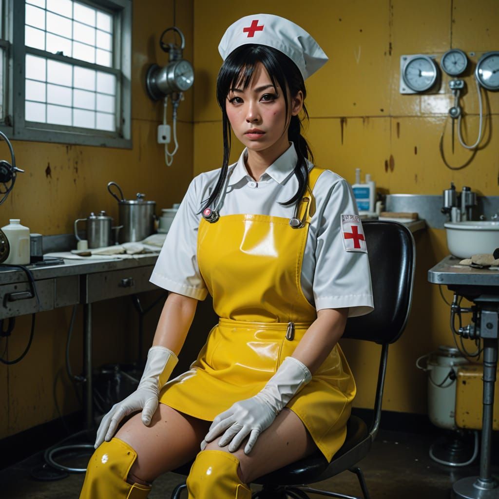 A dramatic, low-angle image of Chiaki Kuriyama as a stern nurse in a gynecological practice. She wears a latex uniform with a yellow rubber apron and is rendered in a sinister, horror style.