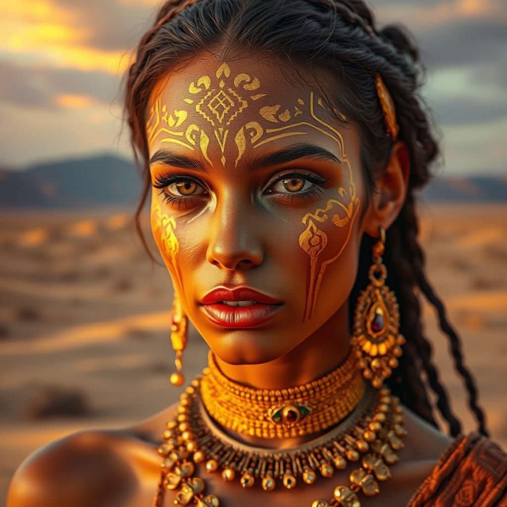 A photorealistic portrait of a woman with glowing tribal markings and gold jewelry. The image features a desert landscape and warm sunset, rendered with sharp focus and cinematic lighting.