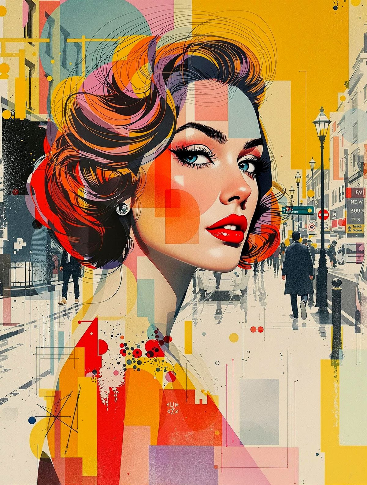 This image shows a glamorous woman in a London street scene, rendered in a mixed media style. The portrait blends flowing watercolor and ink with bold geometric shapes reminiscent of 1960s pop art.