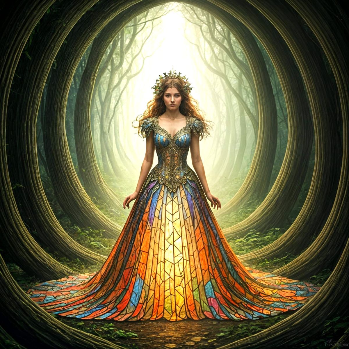Fantasy concept art of a woman in a stained glass dress within a misty enchanted forest. Features ethereal lighting and intricate details, presented as a digital painting.