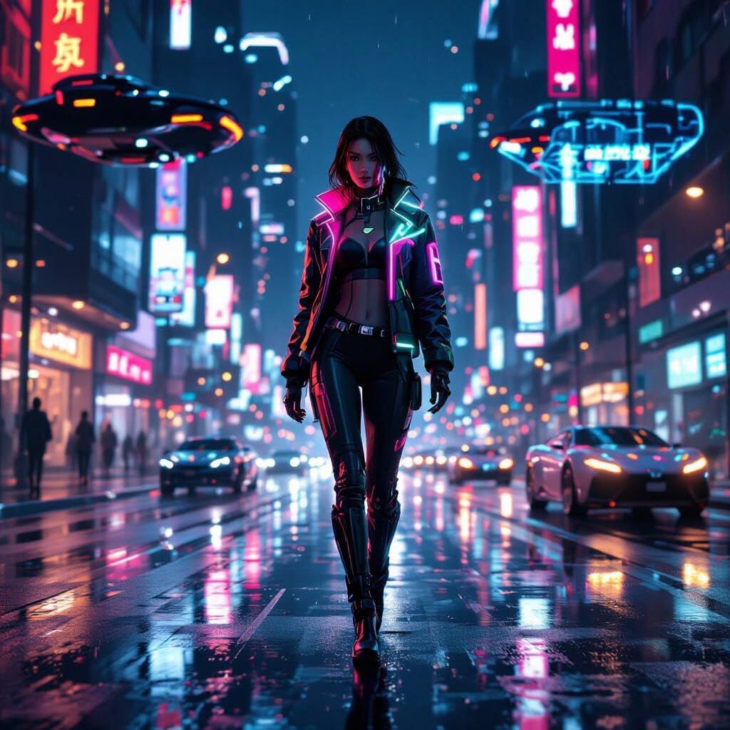 This image shows a beautiful woman in high-tech attire walking through a futuristic cityscape at night. The glossy, neon-lit streets and flying vehicles create a vibrant anime-style scene.