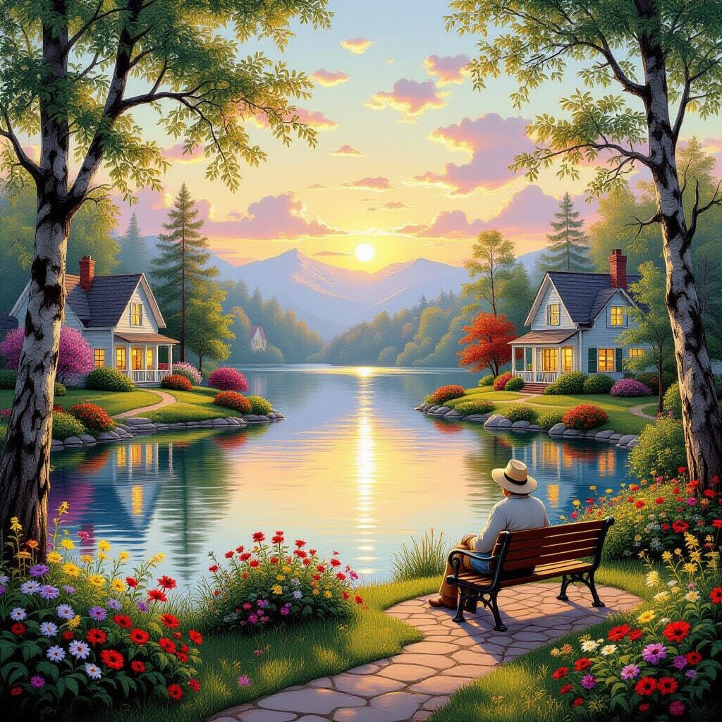 A peaceful lakeside scene with quaint cottages and colorful wildflowers. The image shows an idyllic countryside bathed in warm light, rendered in a painterly style.
