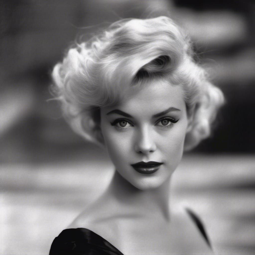 <lora:M2:1.0> Medium shot of Beautiful pin up girl 1950s style. She smiles at the camera. Wearing a bathing suit. Highly detailed. Slightly tanned skin. Wide angle lens. The sun sets on a lush beach in the background.