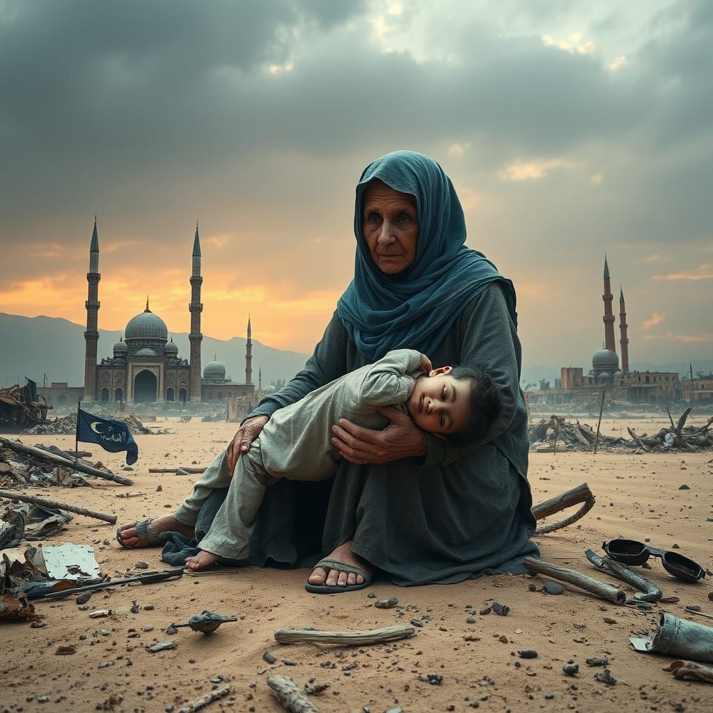 This image depicts an elderly Middle Eastern woman in a blue hijab, cradling her son's body in a ruined desert. The desolate scene includes mosque ruins, Islamic symbols, and a dust-filled sky in a hyper-realistic style.