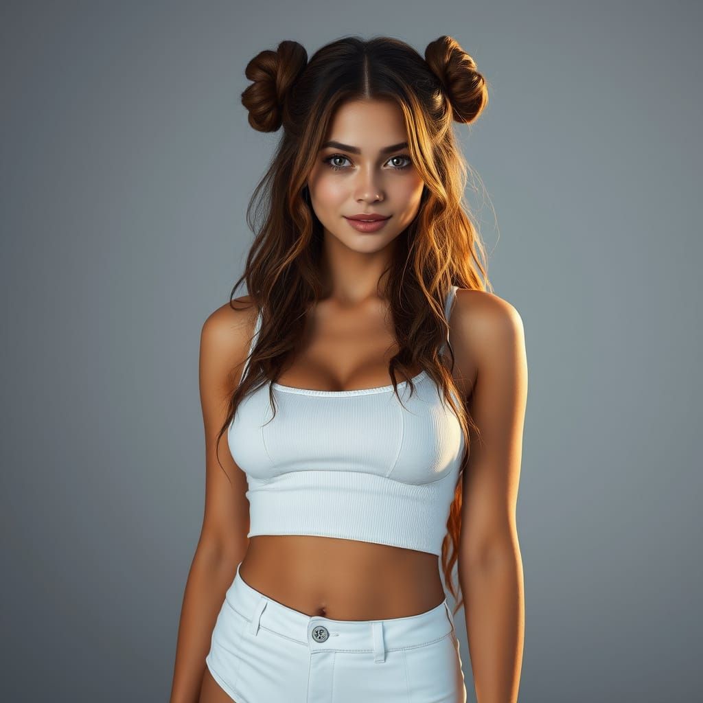 This captivating image showcases a stunning young woman with a heart-shaped face and long, wavy hair, set against a subtle, gradient background. The hyper-realistic artwork boasts deep colors, intricate textures, and vibrant accents, evoking a sense of high-concept art with a focus on detailed environmen...