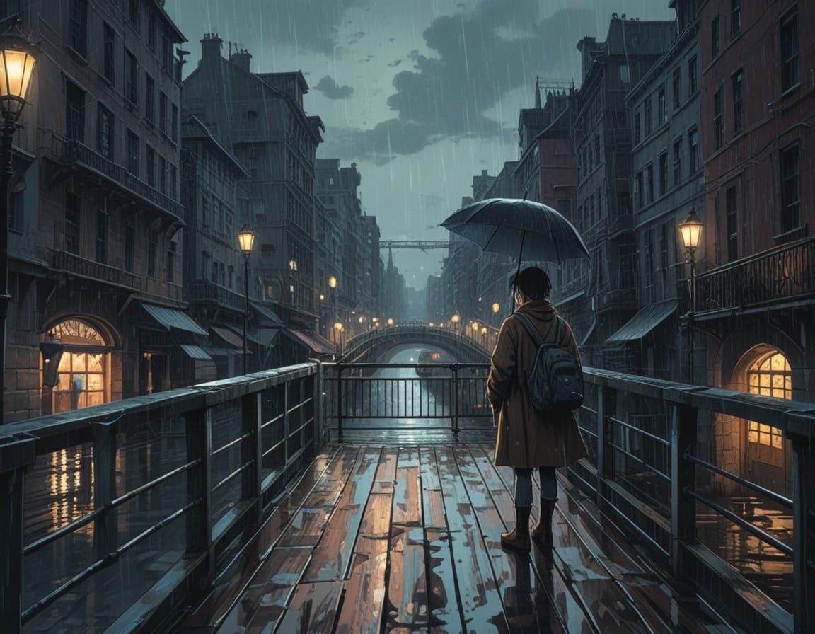 This anime-style image depicts a solitary figure on a bridge overlooking a rainy cityscape. Features cel-shaded details and dramatic lighting.