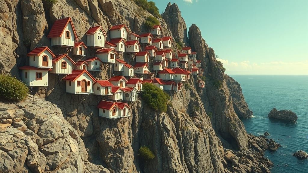 A photorealistic long shot shows a rocky coast with dozens of house-sized birdhouses clinging to the cliffs. The image captures a whimsical Miyazaki-inspired aesthetic with cinematic lighting and film grain.
