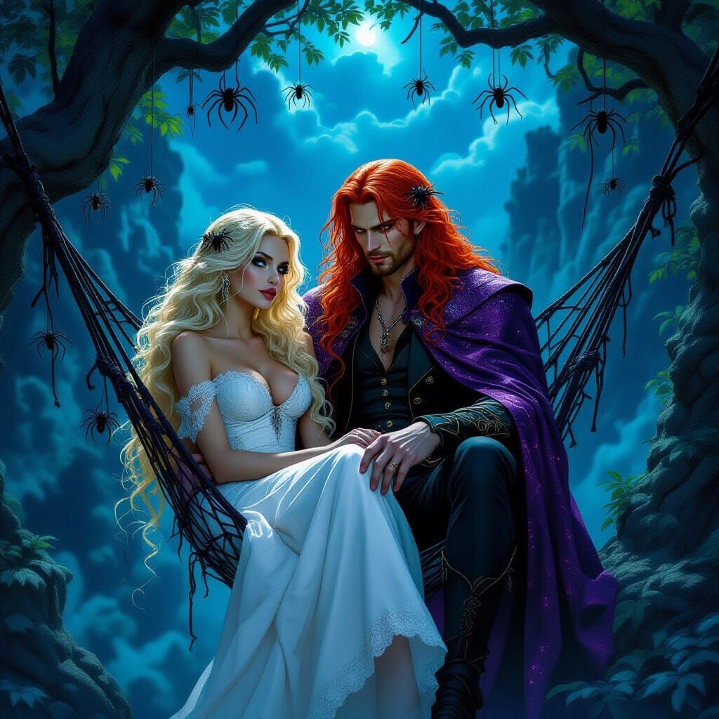 This image depicts a gothic fantasy scene of a redhead vampire and a blonde woman in a spiderweb hammock between trees. Rendered with dramatic lighting and bioluminescent details.