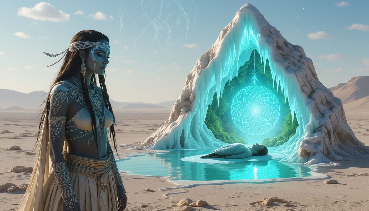 This image shows a mystical shaman with unique skin textures, revealing a glowing frozen oasis within. The barren landscape is filled with cosmic and natural elements, symbolizing balance and imperfection.