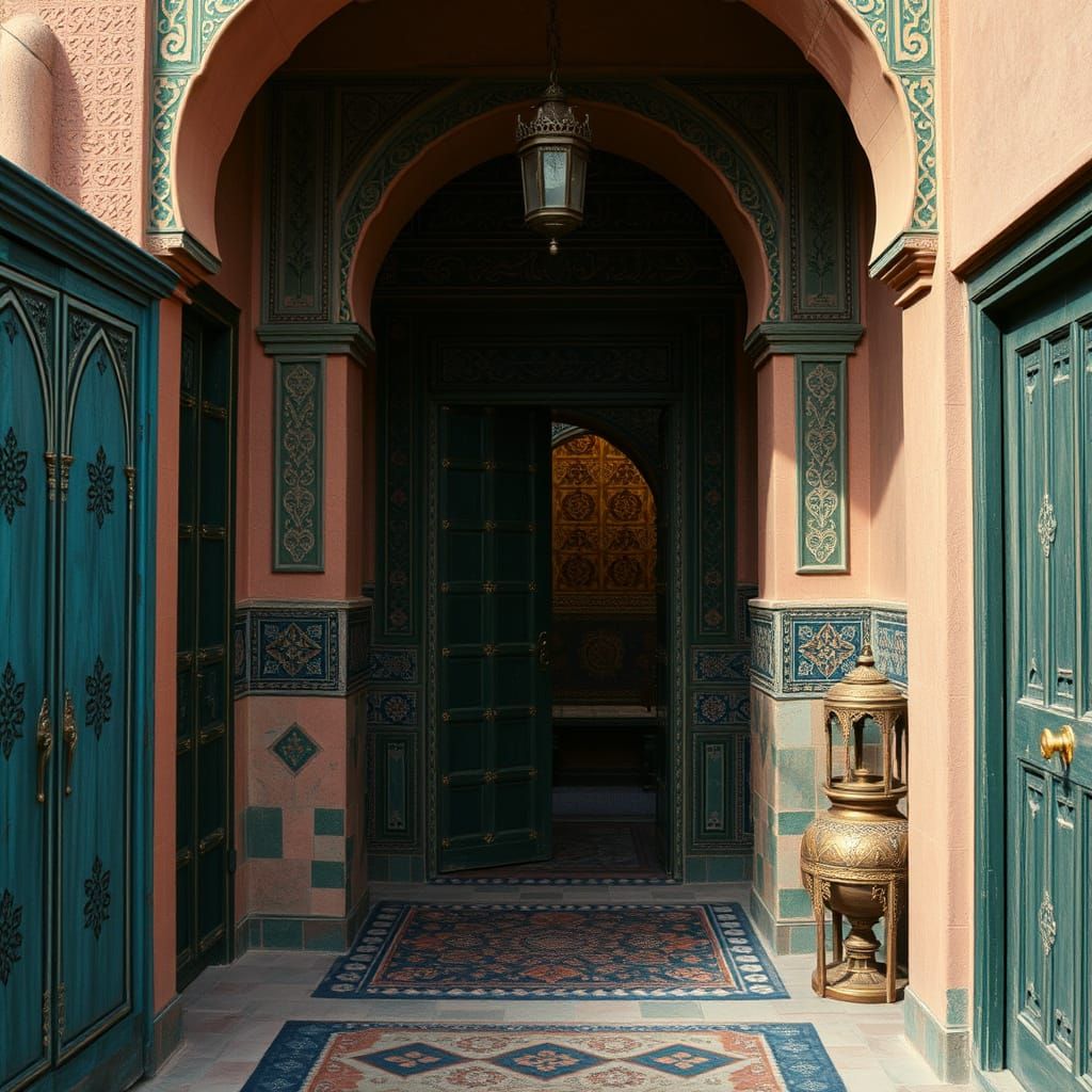 This cinematic image depicts a majestic Moroccan castle with intricate traditional doors and vibrant colors, inspired by the styles of cinematic masters and featuring a dramatic 35mm film aesthetic.