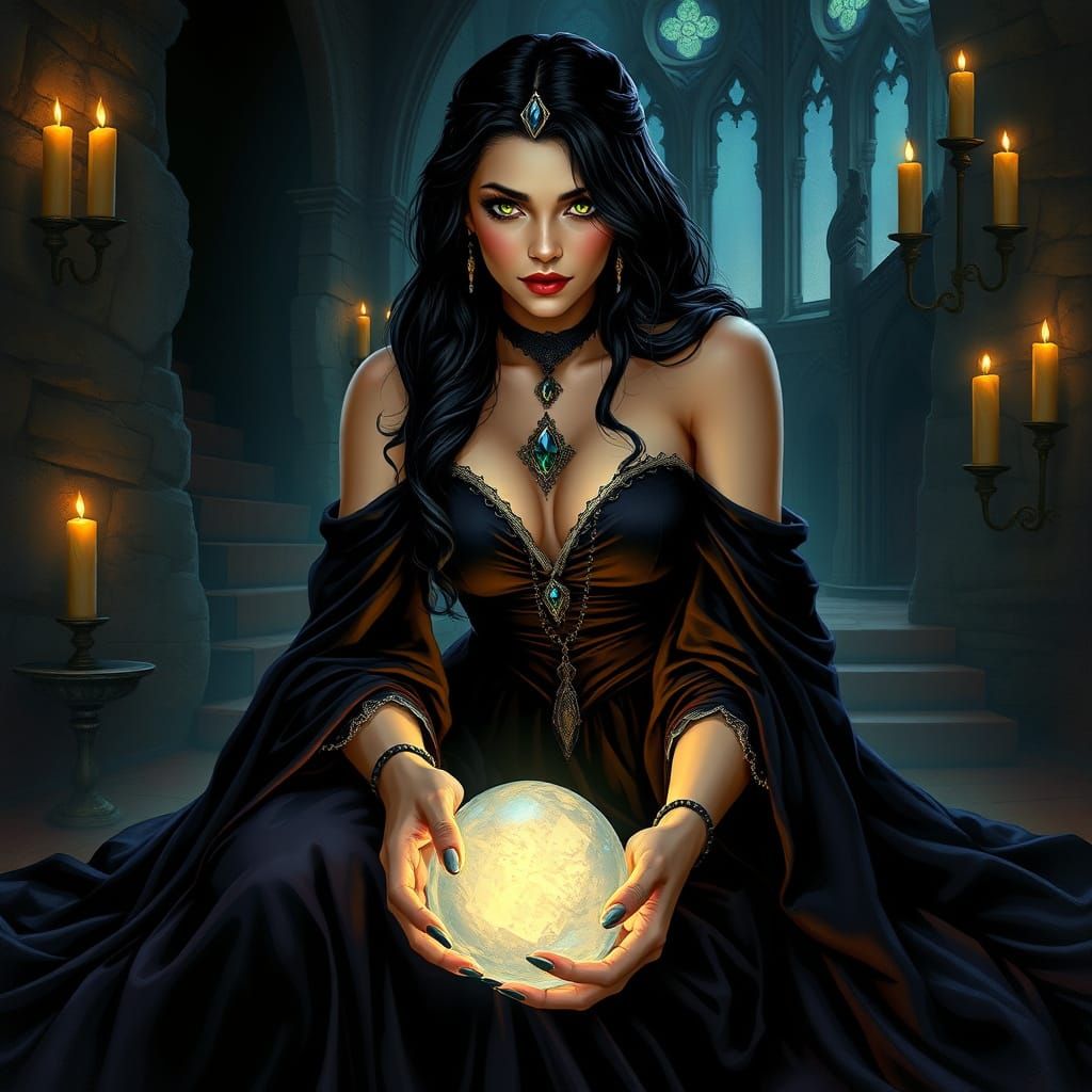 A striking picture of Morgana Le Fay in a dark velvet gown, holding a crystal ball in her castle. The image uses dramatic lighting to create a mystical ambiance, as 3d rendered digital art.