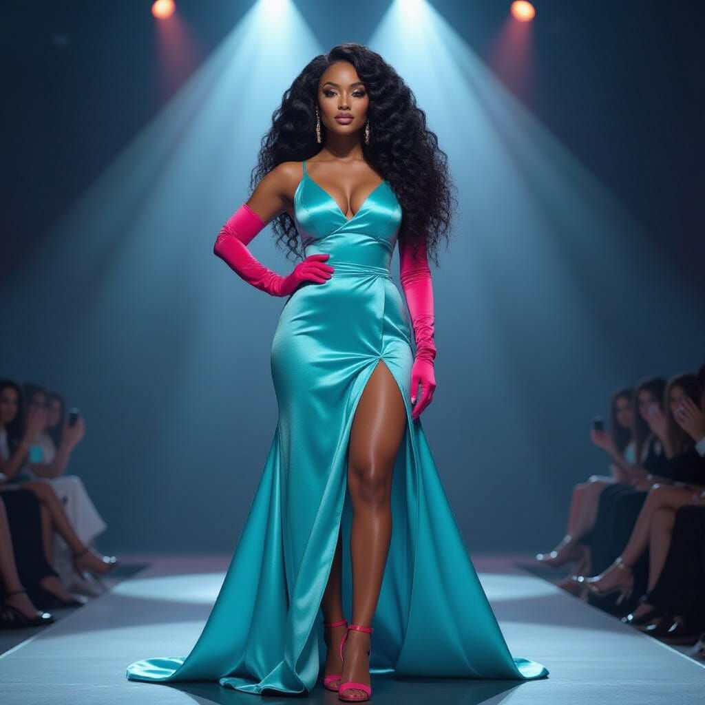 Cinematic film still capturing a stunning Black woman with voluminous ombré hair and glowing skin on a spotlighted stage. Dressed in a vibrant turquoise gown, she embodies modern glamour.