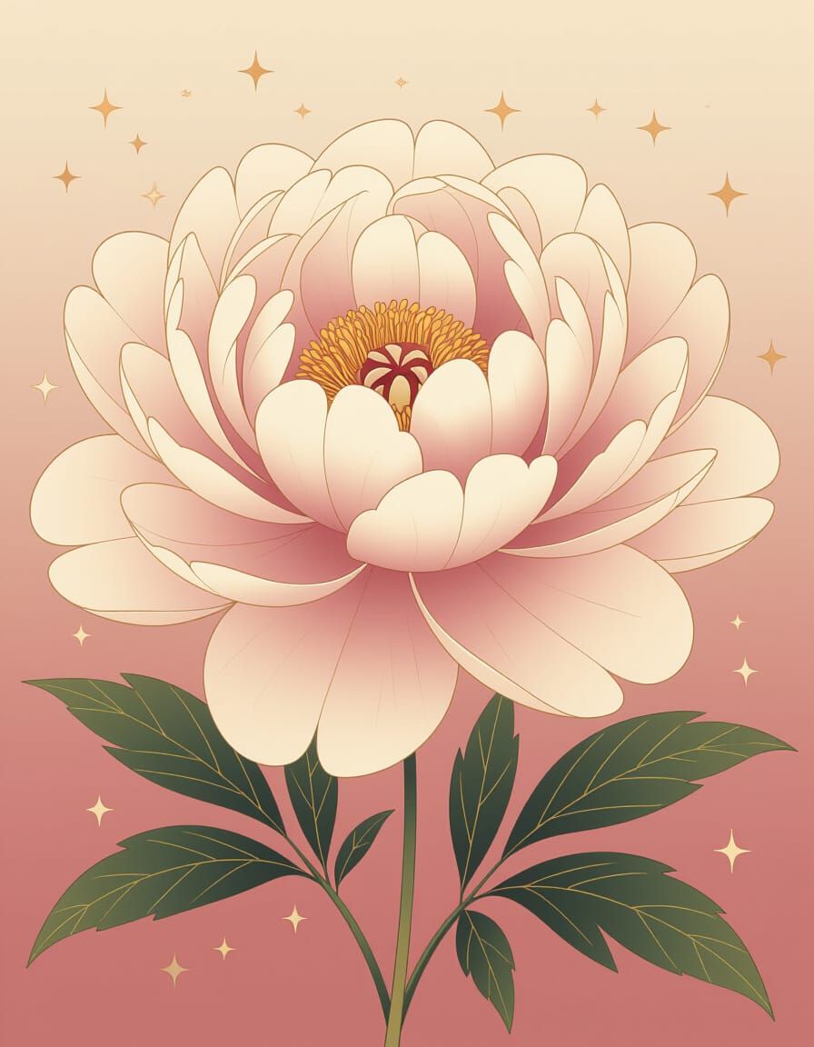 A striking picture of a fully bloomed peony flower with soft, layered petals and delicate golden geometric patterns. The artwork evokes a vintage anime style with a serene and elegant atmosphere.