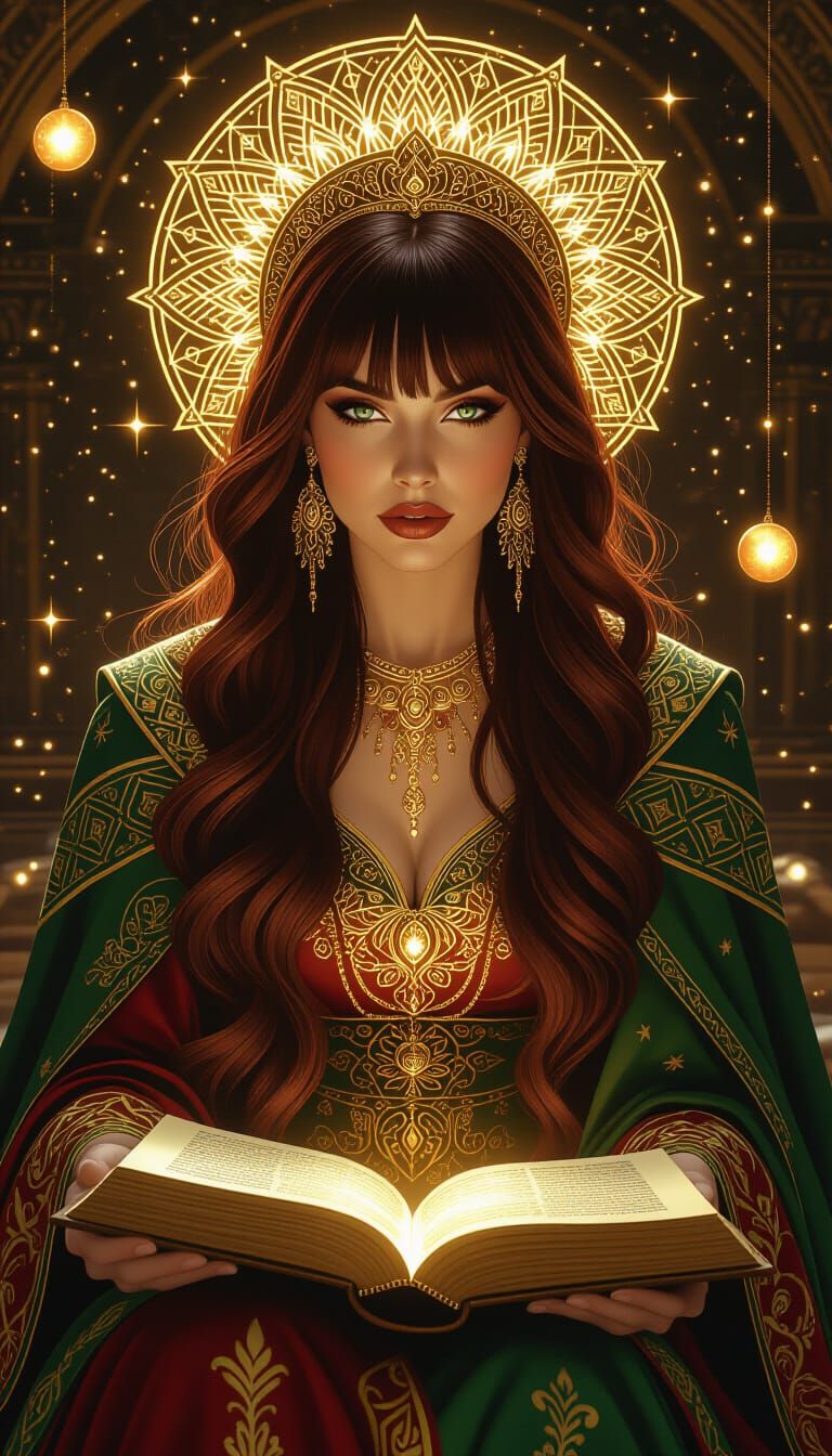 This image shows a mystical woman with long burgundy hair, wearing a golden headdress and earrings. She is surrounded by glowing orbs and an ancient book, all rendered in a warm, cinematic fantasy art style.