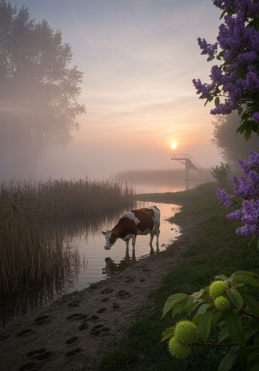 This image captures cows at a serene waterhole during a foggy, beautiful sunset. Reeds line the shore, with hoof prints visible. The scene features soft atmospheric lighting and a subtle bokeh effect.