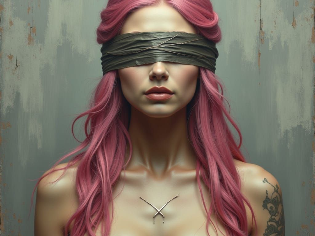 This image shows a woman with pink hair, blindfolded and bound, symbolizing societal oppression. Kintsugi cracks represent her resilience, rendered with expressive brushstrokes and dramatic lighting.