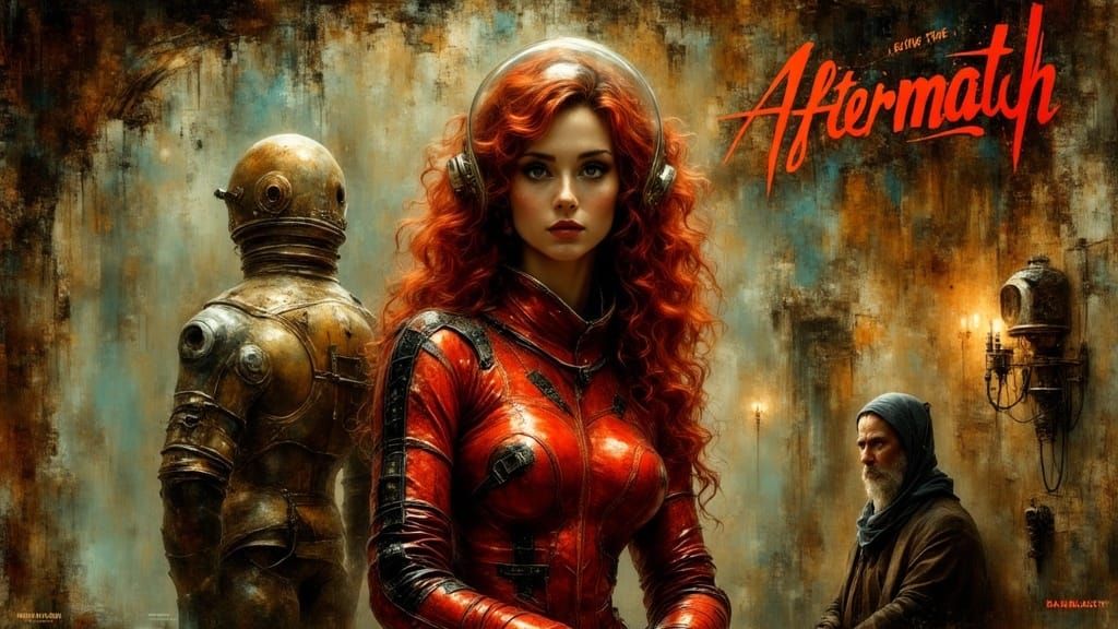 A striking image of a spacesuit-clad bombshell in a dimly lit, moody dungeon, surrounded by distressed walls adorned with vintage sci-fi elements and retro-futuristic gear, exuding a sense of nervousness and adventure.