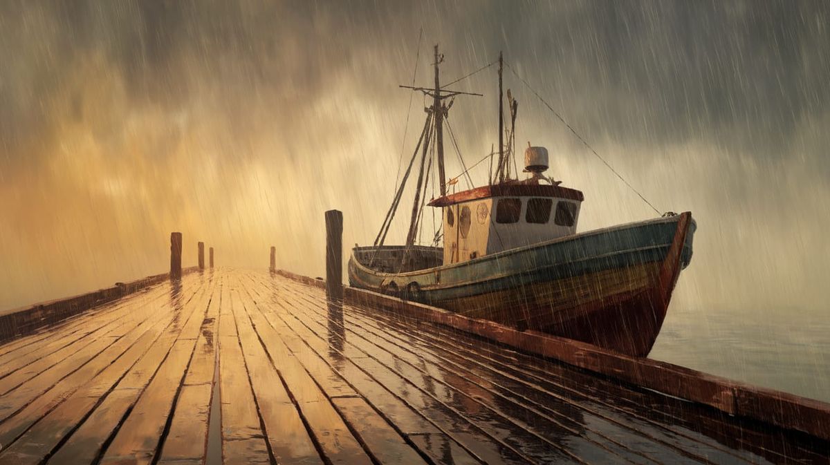 This image shows a serene Alaskan fishing boat docked beside a lonely pier, bathed in warm golden hues that contrast with the cool tones of the rain-soaked surroundings, evoking a sense of solitude and serenity.