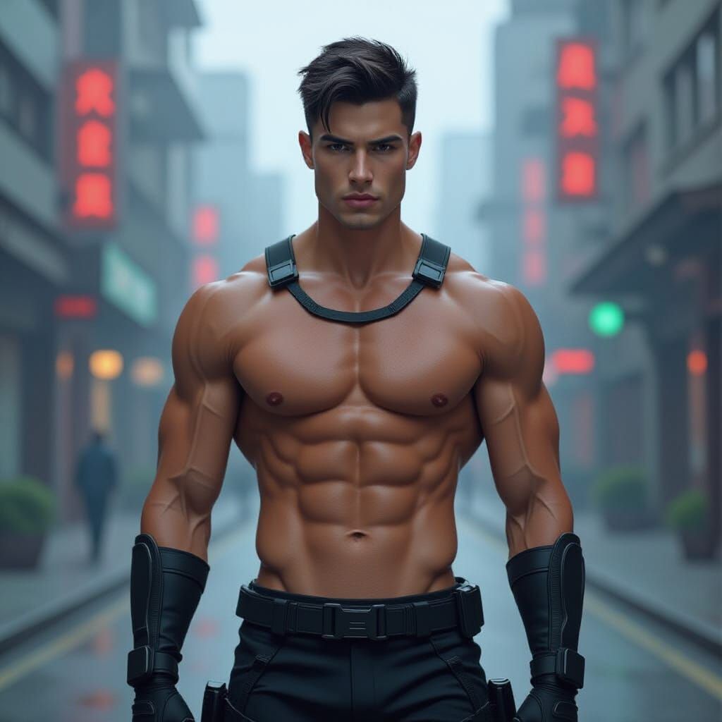 This image shows a sporty figure with a crew cut, tan skin, and muscular build, posing outdoors in a futuristic style. The scene features neon accents and sleek lines, creating a mysterious atmosphere.