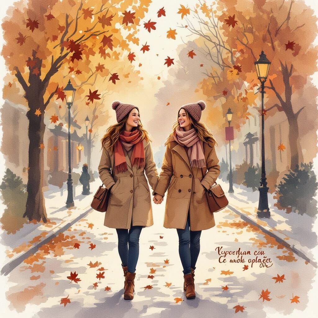 This image shows two female friends walking hand-in-hand down a colorful autumn street, laughing warmly. The scene is rendered in a soft, feminine watercolor style with a warm color palette.