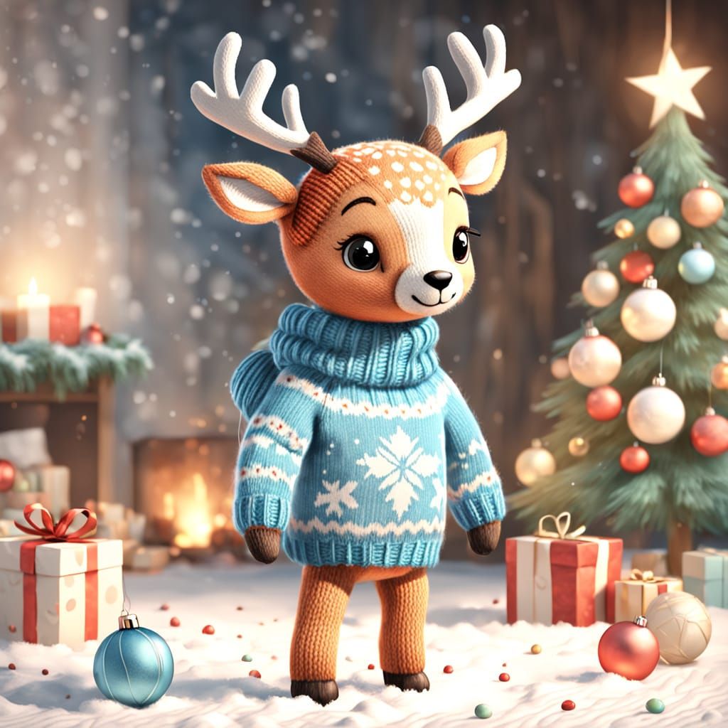 A delightful watercolor sketch of a toy deer cub standing on two legs, dressed in a knitted sweater. The festive background and gentle washes create a whimsical, charming scene perfect for children.