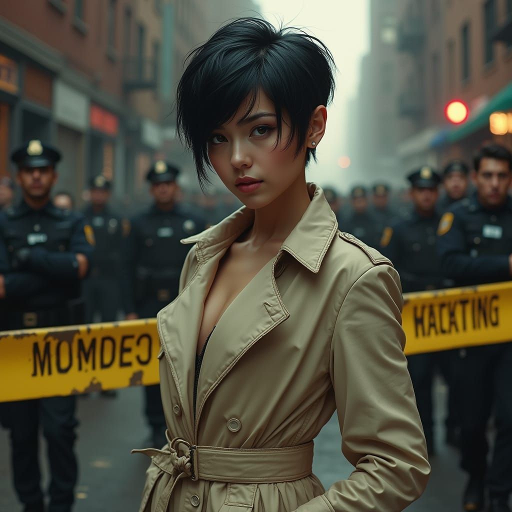 This image shows a woman standing near a police barricade in Boston's Combat Zone, surrounded by towering skyscrapers and dimly lit alleys. She wears a belted trench coat and has dark, textured hair, with a sense of intensity in her eyes. The atmosphere is tense and foreboding, with a hint of cinematic f...