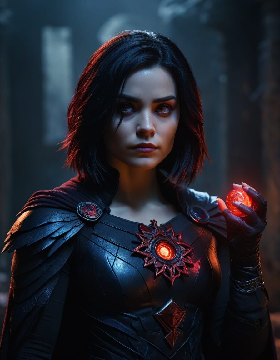 This image shows Emma Myers as Raven, a superheroine from DC's Titans. She has dark hair, a glowing red amulet, and a mystical aura, all rendered in a dark fantasy art style.