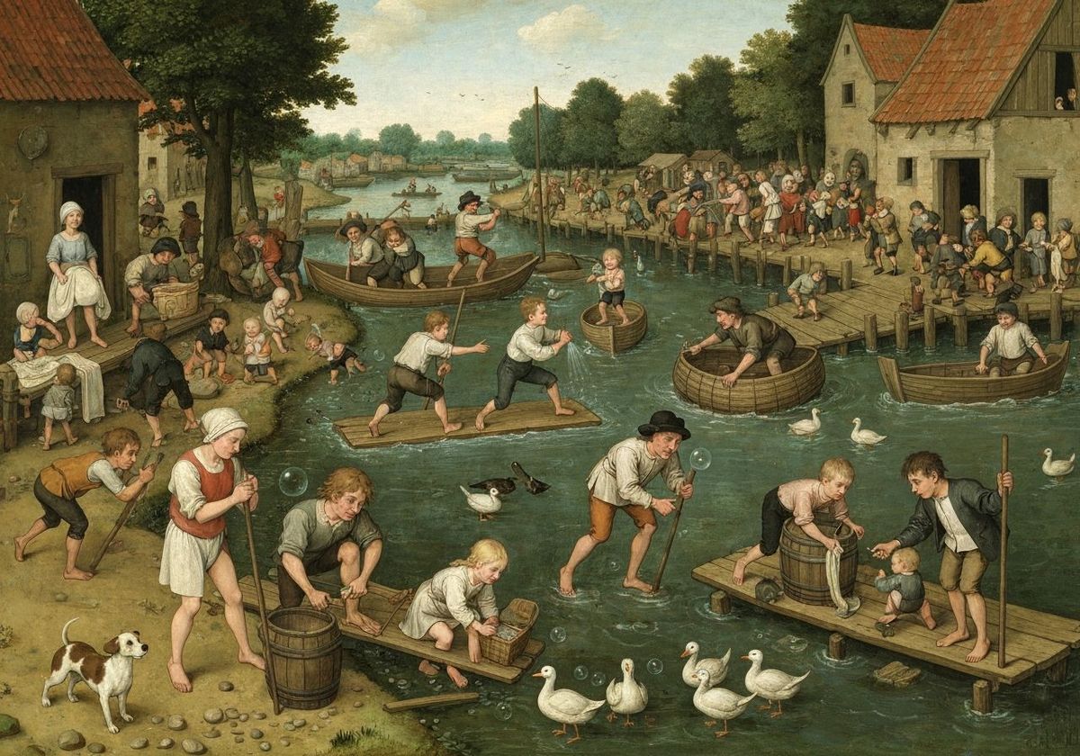 This image shows a lively Renaissance village scene brimming with activity. Children play in the water, teens engage in mock battles, and peasants participate in races, all rendered with earthy tones and rich detail.