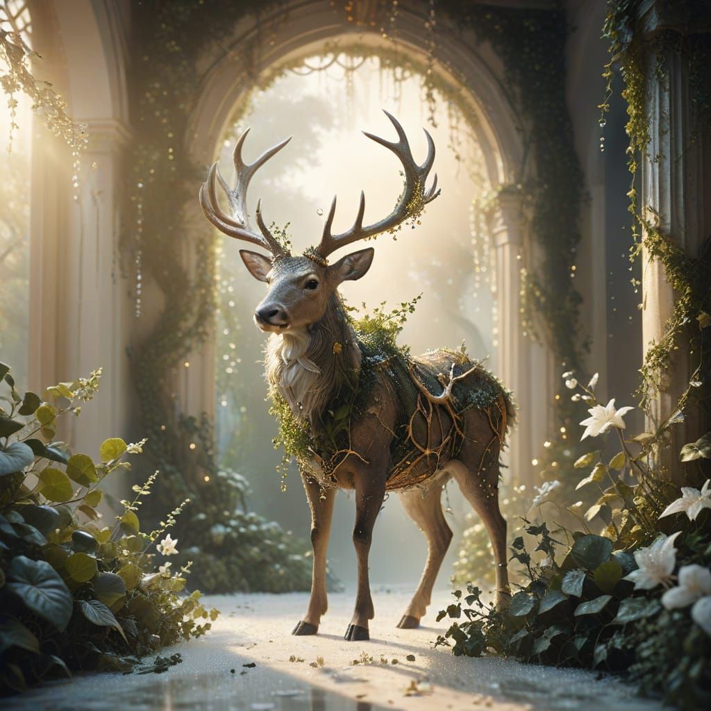A striking picture of a deer-like creature adorned with ivy and flora. Bathed in heavenly sunshine and pastel colors, the digital art style evokes a sense of cinematic grandeur.