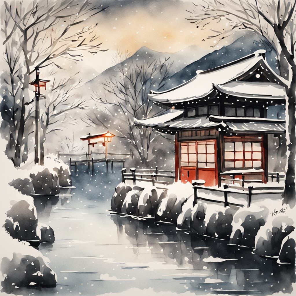 This image shows a snow-covered kiosk in Otaru, rendered in a Sumi-e style. This traditional Japanese ink painting features delicate brushstrokes and soft watercolor textures, creating a serene winter scene.