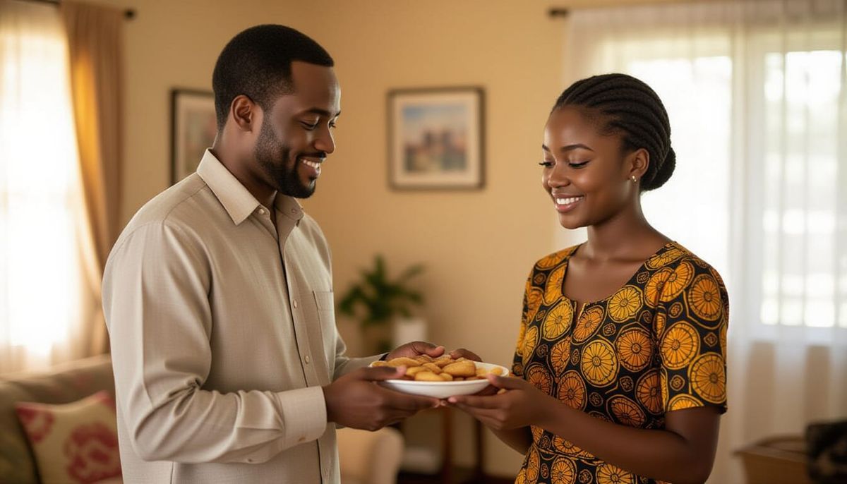 Mid-30s African man in a simple, neat long-sleeve shirt offers food to an 18-year-old fair-skinned African girl in modest fine cloth, her hair in neat cornrows pulled back into a low bun. She stands politely in a cozy guest room, showing respect and gratitude. Warm indoor lighting, realistic style, soft emotional tone, focus on gentle interaction and boundaries.