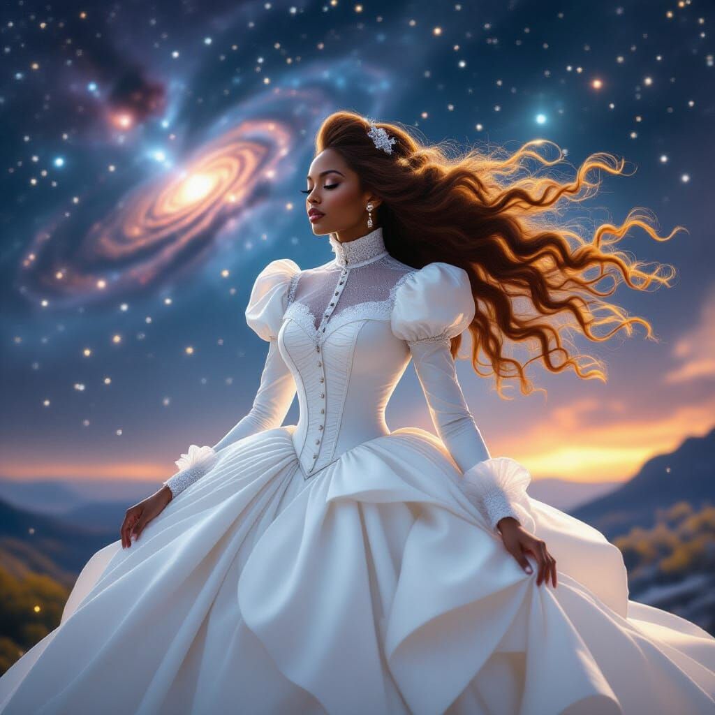 This image shows a beautiful Black woman in a Victorian-era white ballgown. Her long auburn hair blends into glowing stars amidst magical silver sparkles and swirling galaxies, all set in a dreamlike cosmic landscape.