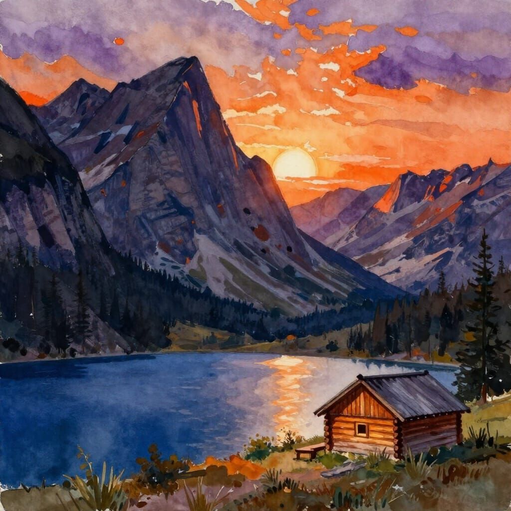 This image captures a jagged mountain range at sunset, with a deep blue lake and a glowing log cabin. Rendered in an expressive watercolor style with vibrant, bleeding colors.