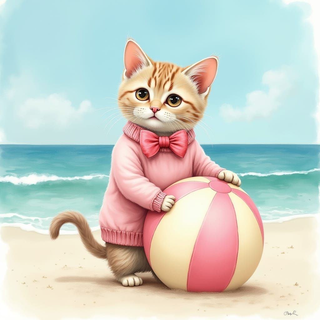 A charming watercolor painting of a cat in a pastel pink sweater and bow tie, posed with a vintage beach ball on a serene shoreline with white sand, turquoise waves, and a brilliant blue sky.
