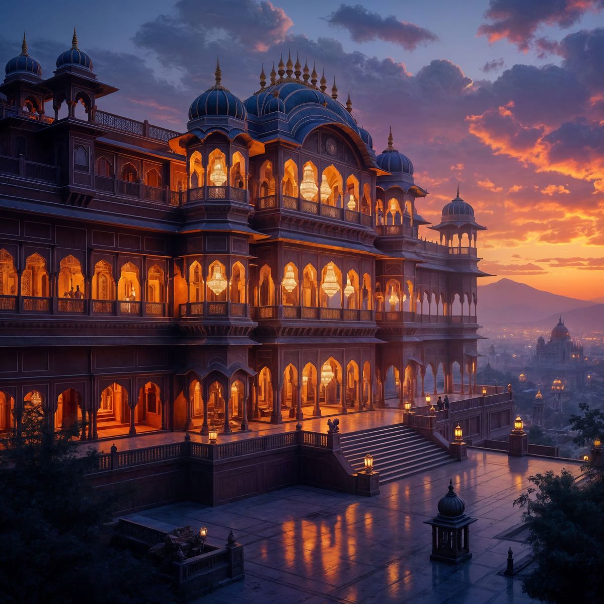 A digital rendering of a futuristic palace in Jaipur, India, showcases a blend of traditional Indian design with industrial elements. Ornate balconies and crystal chandeliers adorn the spectacular architecture.
