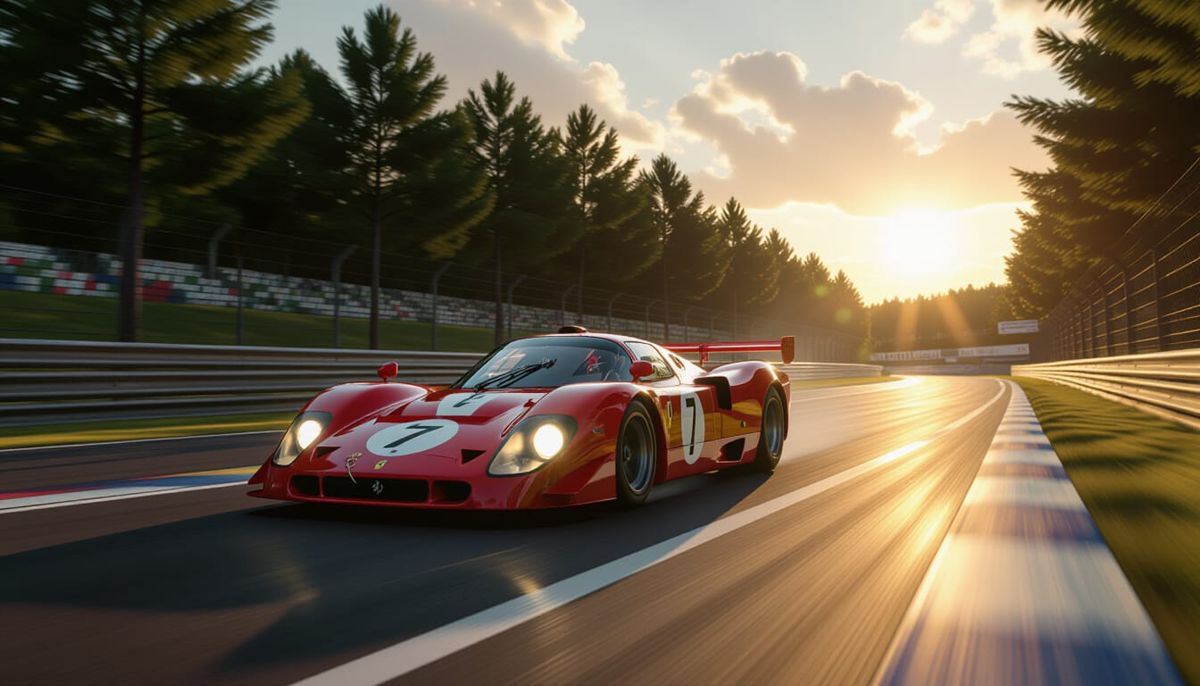 A dynamic image of a red Ferrari race car speeding down a straightaway at Le Mans. The picture features cinematic lighting, subtle film grain, and vibrant colors in a hyper-realistic style.