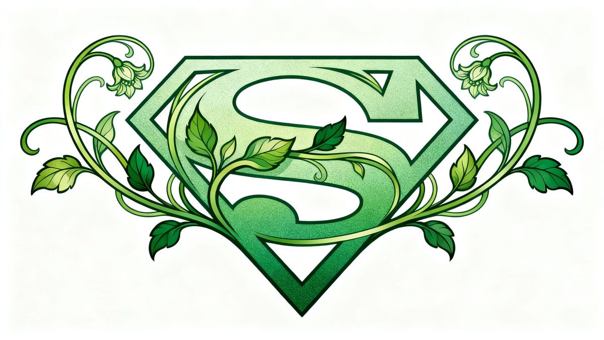 This image displays a striking Superman emblem rendered in the elegant Art Nouveau style with a vibrant green color palette.