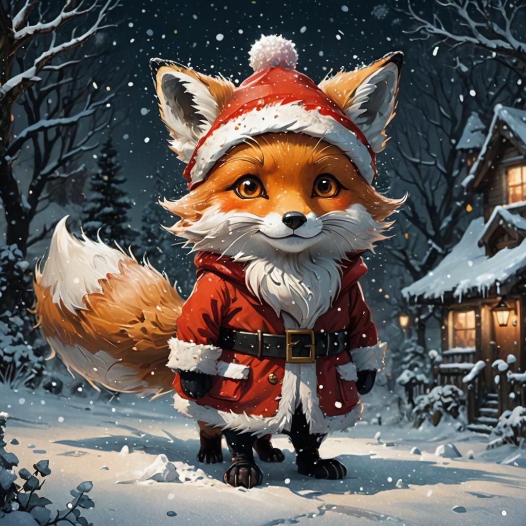 This image shows an anthropomorphic fox dressed as Santa Claus in a festive winter scene. The digital painting style incorporates realism with surreal and fantastical elements, using bright, warm lighting and intricate details.