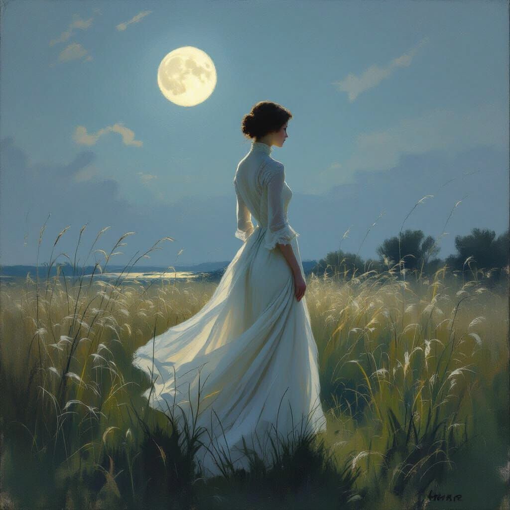 This image shows a woman in a vintage gown in a moonlit field, her silhouette highlighted by the soft glow. Rendered in an Impressionist style with delicate brushstrokes.