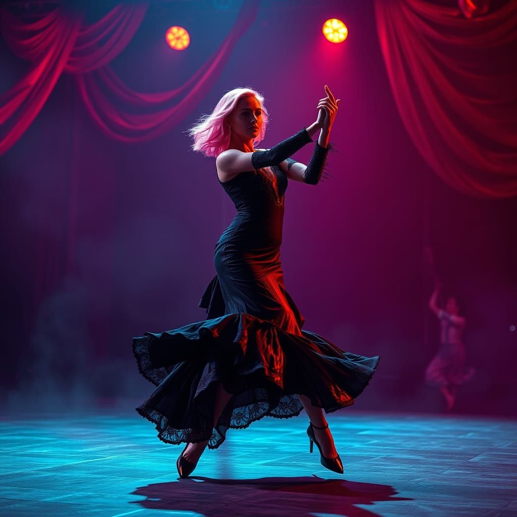 This image shows a pink-haired flamenco dancer with violet eyes in a black dress, dancing on a dimly lit stage. The image features dynamic and volumetric lighting reminiscent of Art Nouveau.