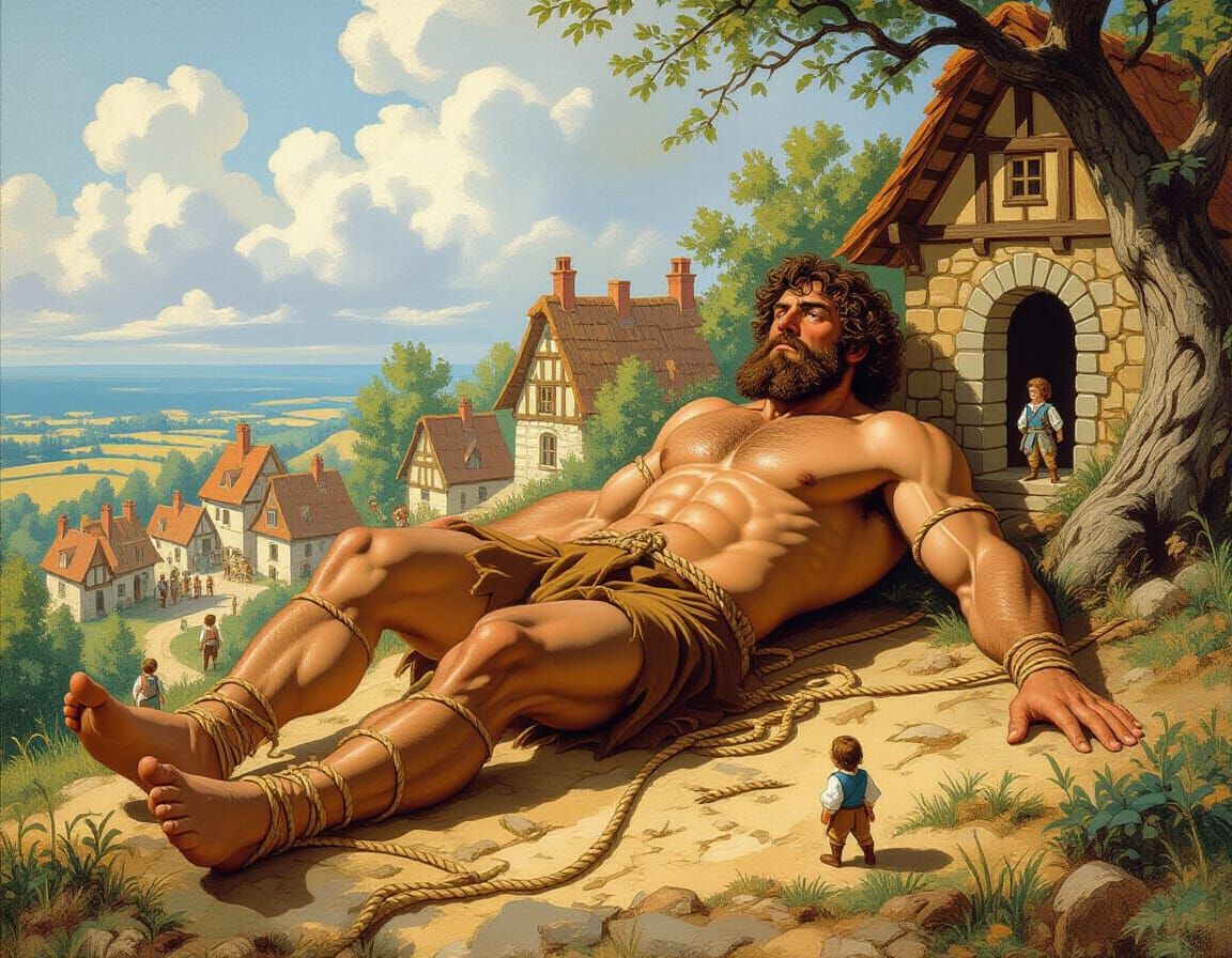 This image shows Gulliver, a powerfully built and hairy man in a loincloth, restrained with ropes near a miniature Lilliputian village, observed by the tiny people in awe, rendered with a romantic and whimsical aesthetic.
