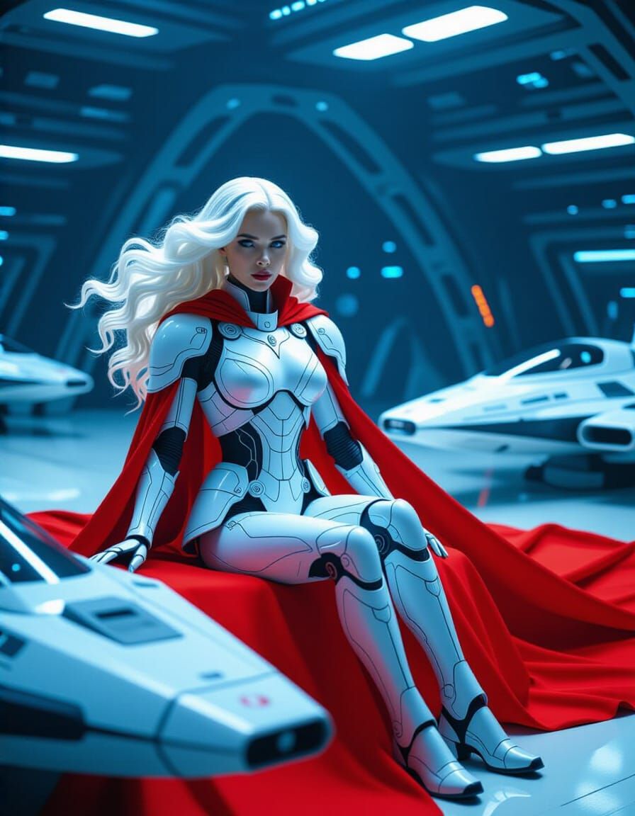 This image shows a robotic woman with white hair, blue armor, and a red cape, seated among spaceships in a space station. The image has dramatic lighting and a futuristic aesthetic.