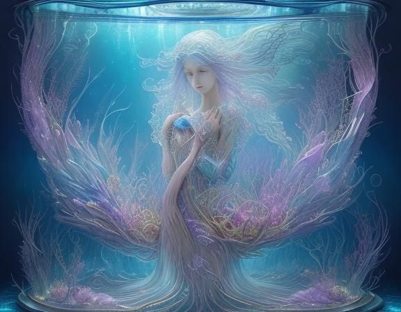 A surreal dreamscape featuring a transparent glass train traveling underwater. This detailed fantasy artwork showcases visible aquatic internals in a dreamy and ethereal style.