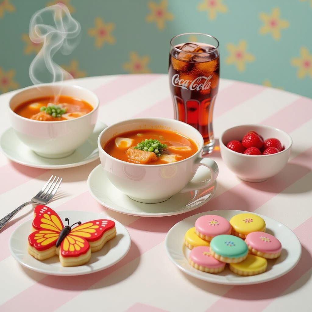 A vibrant lunch set on a pastel tablecloth features kimchi soup, a butterfly cake, soda, strawberry candy, and rainbow cookies. The image is in a colorful, modern pop art style.