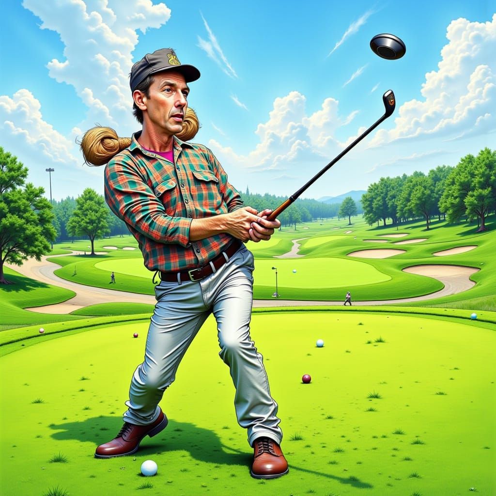 This image shows Happy Gilmore swinging a hockey stick on a golf course. The style is reminiscent of comic book art, with bold lines, vibrant colors, and exaggerated poses, in a dynamic and humorous scene.